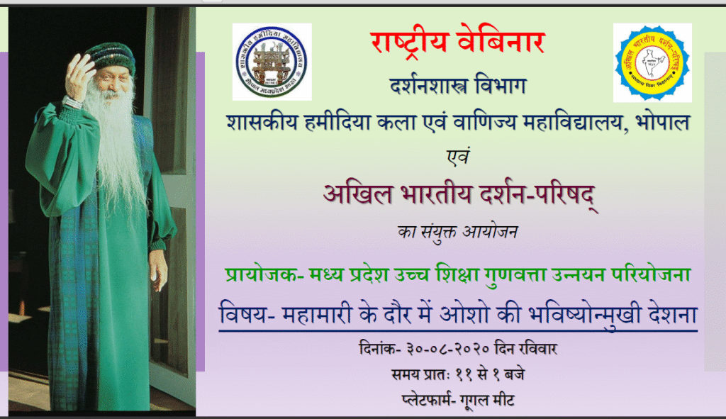 *प्रिय आत्मन!*महापुरुषों ने अपने काल का अतिक्रमण कर भविष्य की समस्याओं पर पूर्व में ही समाधानकारक विमर्श किये हैं।मध्य प्रदेश की भूमि को अपनी देशना एवं तर्कों से वैश्विक मंच प्रदान करने वाले ऐसे ही भविष्यद्रष्टा हैं, *आचार्य रजनीश उपाख्य ओशो* ।यह समीचीन होगा कि ओशो के सामयिक विमर्श को सम्मुख प्रस्तुत किया जाय।इसी तथ्य को ध्यान में रखकर शा हमीदिया महाविद्यालय,भोपाल एवं अखिल भारतीय दर्शन- परिषद द्वारा दिनांक 30.08.2020 को गूगल मीट पर राष्ट्रीय वेबिनार का आयोजन किया जा रहा है।पंजीयित पार्षदों को ई- प्रमाणपत्र प्रदान किया जावेगा जिसका लिंक साथ में प्रदान किया जा रहा है-https://forms.gle/xZVyXBBDy5SrU2Gy8वेबिनार हेतु 30.08.2020 को meet पर जुड़कर अपना mic और Video बन्द कर दें।अलग से कोई पासवर्ड और id नहीं प्रदान की जाएगी।*लिंक* -https://meet.google.com/dqg-zhwy-aokसहयोग कर कृतार्थ करें।_निवेदक_*हमीदिया महाविद्यालय* परिवारएवं*अखिल भारतीय दर्शन-परिषद*
